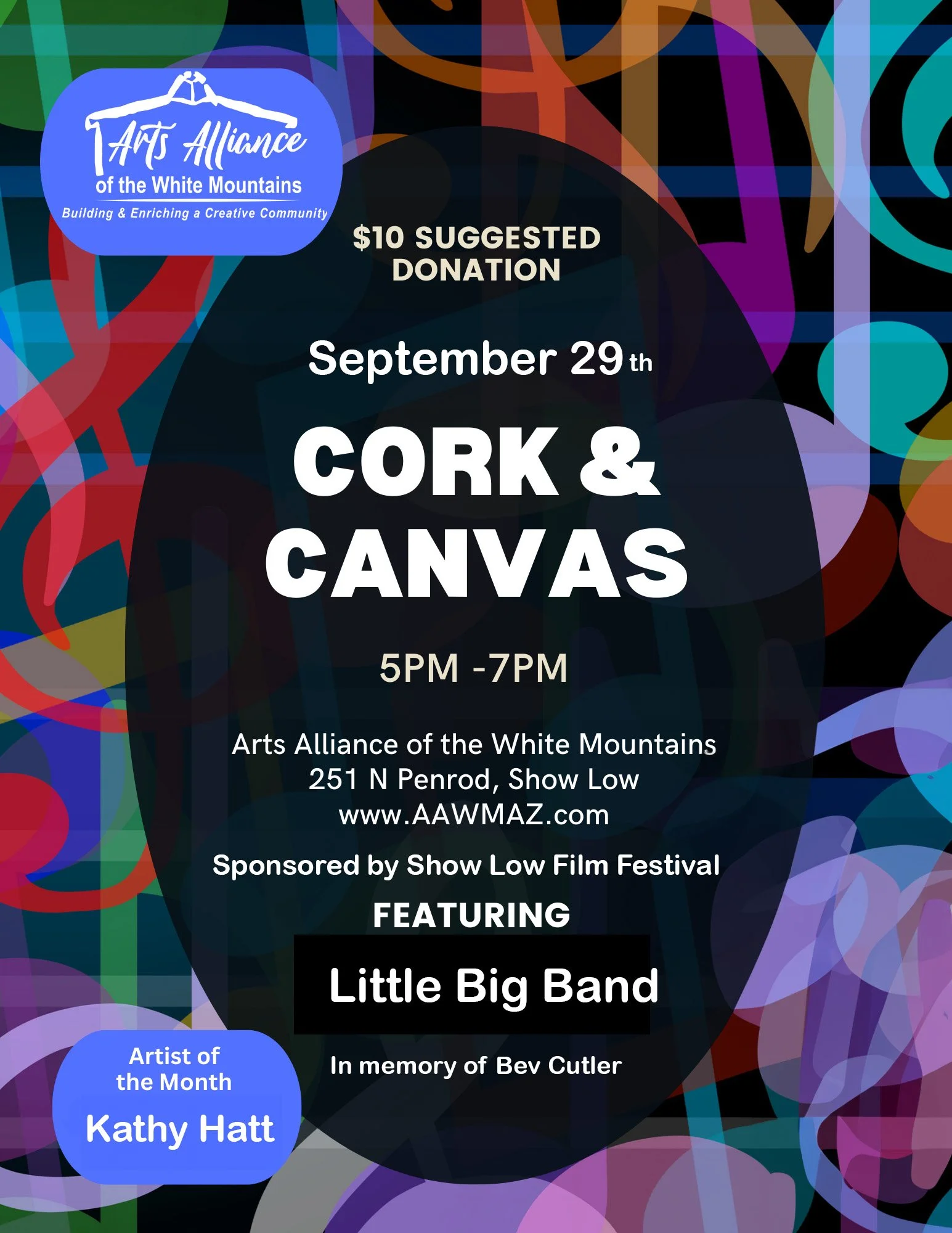 Cork & Canvas Friday, September 29, 2023 5:00 PM 7:00 PM Art Alliance of the White Mountains 251 Penrod Road Show Low, AZ, 85901 United States (map) Google Calendar ICS